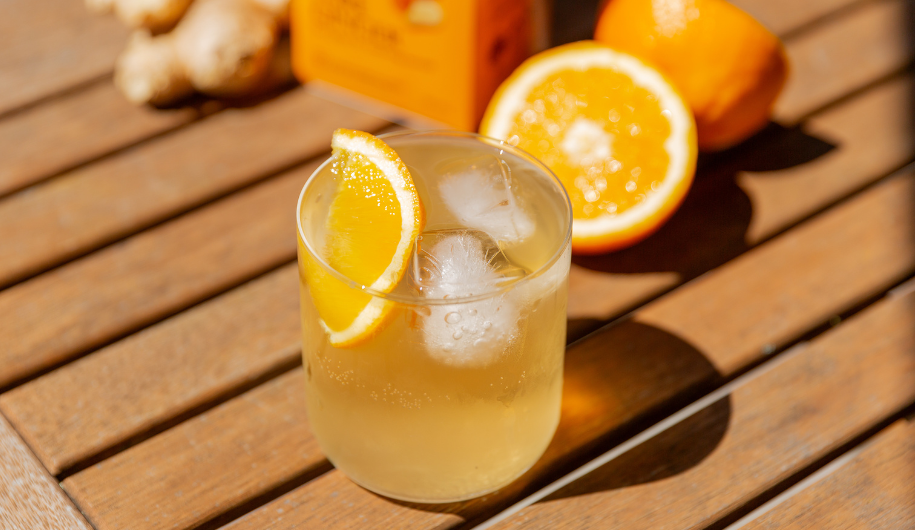 This refreshing Pure Ginger Zinger iced tea blends organic lemon and ginger tea with fresh orange juice and a touch of agave syrup for a zesty drink made for warm days and easy entertaining.