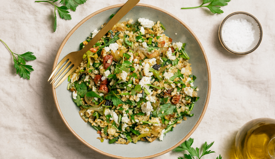 A hearty, flavour-packed salad from The Two Raw Sisters that comes together in under 30 minutes. Sweet caramelised onions and leeks are folded through lemony bulgur wheat, then finished with crumbled feta, toasted seeds and a generous handful of fresh herbs.