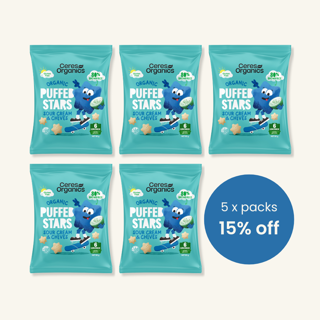 Our Ceres Organics Puffed Stars, Sour Cream & Chives are now available in a convenient case of 5 x 80g packets.